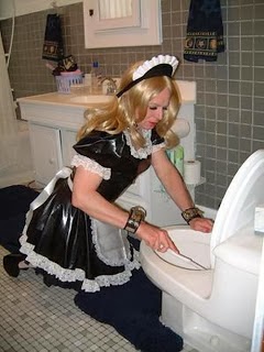 The first step is to don a pair of bright pink rubber gloves. Then vacuum the bathroom while it is dry making sure to remove any hair that is lying around, This ensures that hair doesn’t interfere with any of the cleaning you do later. Then spray a mould remover all through the shower recess. Leave that while it does its work and then clean the toilet. Make sure the lid, the seat, under the seat and the bowl are all scrubbed clean. Flush the toilet and wipe down the seat. Then get to work on the bath and sink with a cream cleanser such as Jif. Use an old toothbrush to clean under the base of the taps to clean out all the grime that has lodged there. After wiping down rinse off using a watering can filled with hot water. This ensures there are no streak marks left. A great idea. Return to the shower recess. Wipe down the mould remover and use the toothbrush to get into any nooks and cranny’s that cannot be reached with your sponge. Again use the watering can to rinse off, ensuring there are no streak marks. Next use a paper towel and a window cleaning product to clean the mirror. It is vital this is done perfectly as Your Mistress will be looking in that mirror at Herself. The final task is with bucket and mop clean the floor. Allow to dry before replacing any mats etc.